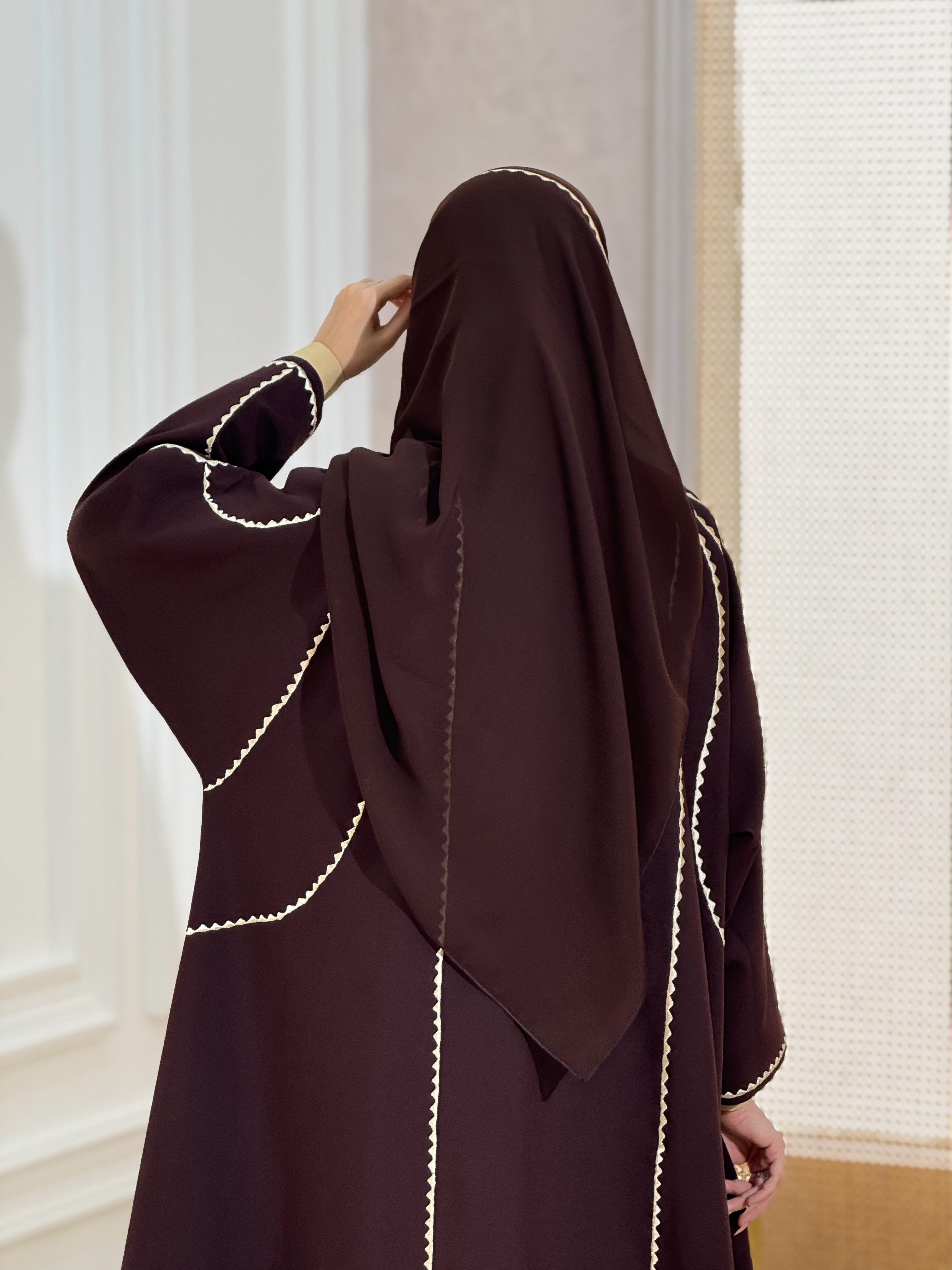قصتها كلوش❤️‍🔥لون بني قصة الرقبه حلوة وساترة مع تطريز جميل ❤️‍🔥 قماشها كريب واقف وراكز وعملي وخفيف❤️‍🔥 الشيلة فيها تطريز بعد ❤️‍🔥